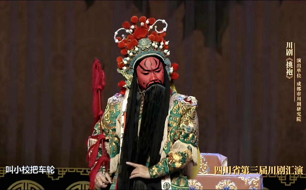 川剧折戏《挑袍》又名《辞曹挑袍》《关公挑袍》,事出《三国演义》。建安五年(公元200年),曹操东征刘备,关羽兵败被俘,暂时投靠曹操。得知刘备下落后,关羽挂印封金辞曹奔刘,保二位皇嫂(刘备在战败中被掳至曹营的甘夫人、糜夫人)出许昌往冀州。曹操不愿其离去,遂率张文远、许褚追至灞陵桥“送行”。曹操赐以美酒、锦袍,欲诓关羽下马以让其转回许昌。关羽疑其有诈,坐马上以刀代饮美酒,后又以刀挑起锦袍扬长而去,曹操为之叹息。此为川剧红生唱做均重的功夫戏,以“汉腔”演唱,并插有昆曲。
