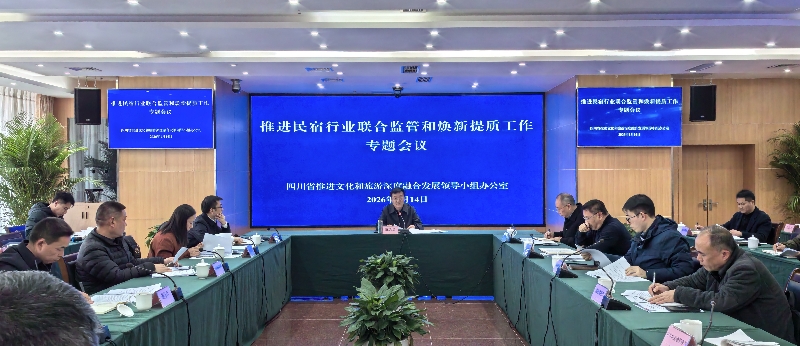 2026年1月14日,省推进文化和旅游深度融合发展领导小组办公室召集相关单位召开推进民宿行业联合监管和焕新提质工作专题会议,深入贯彻省委十二届七次全会及省政府专题会议精神,重点围绕“蜀韵千宿民宿规范经营指引清单、安全管理提升赋能政策清单”等内容进行深入研讨,统一了思想认识,形成了工作合力。省推进文化和旅游深度融合发展领导小组办公室主任、文化和旅游厅党组书记、厅长陈光浩出席会议并主持讲话,文化和旅游厅副厅长王成平通报工作推进情况。