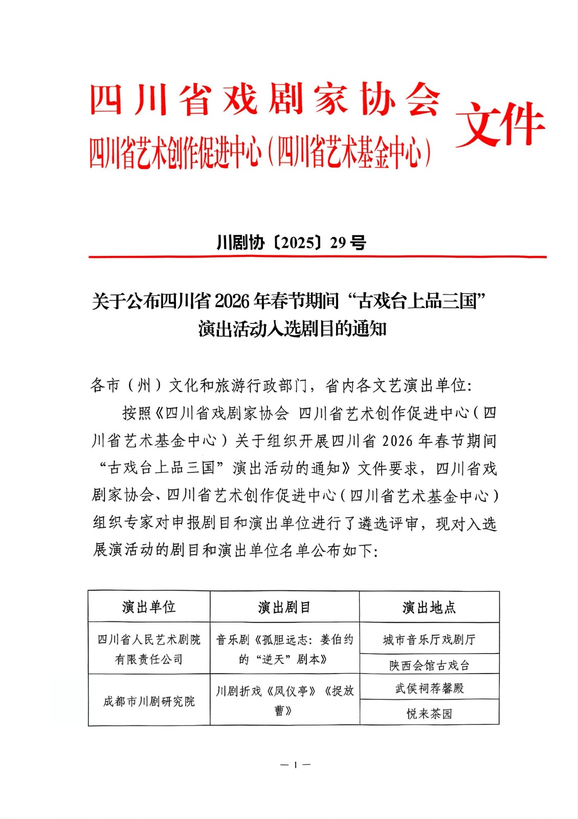 关于公布四川省2026年春节期间“古戏台上品三国” 演出活动入选剧目的通知