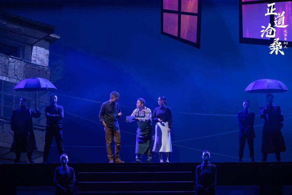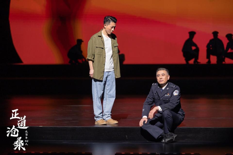 优秀的舞台设计绝不是简单地对现实场景进行复现,而是要通过视觉符号的提炼与组织,营造出与主题相匹配的精神场域。《百年树人》的舞台美学,旨在创造一种既具历史“沧桑”感又具现实警示性的氛围。该剧的灯光与色彩运用尤为出色。例如在表现剧中人物沉溺于网络主播打赏的情节中,分割的上下舞台空间以及冷暖色的对比,为观众提供了直观的“情绪表达”,同时也推进了剧情,大大节约了故事时间。再例如在结尾处,郝建功的亡妻和年幼的儿子在暖光中现身,规劝这位曾经的打黑英雄,突显出人情与人性。