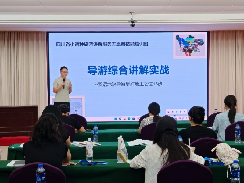 培训为期一周,邀请了省内相关高校教授、资深外语导游、安全应急管理专家等现场教学,采取理论讲授、案例分析、情景模拟、实操演练、考核评估等多元化教学模式,强调互动性与实践性,侧重帮助志愿者了解四川自然生态之美、多彩人文之韵,熟悉入境旅游团队组织运行流程、掌握导游服务规范、学习跨国交流技巧、提升应急处置和专业服务能力,真正做到懂四川、通语言、精服务、善沟通。